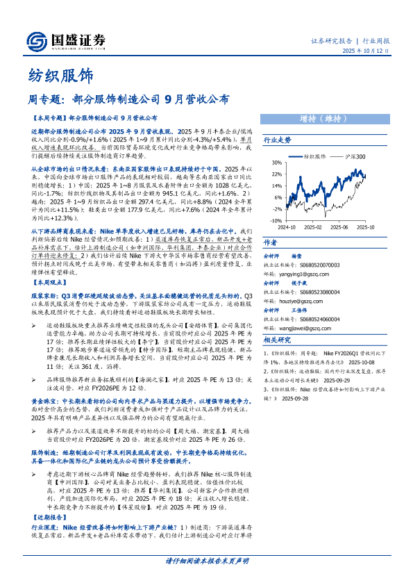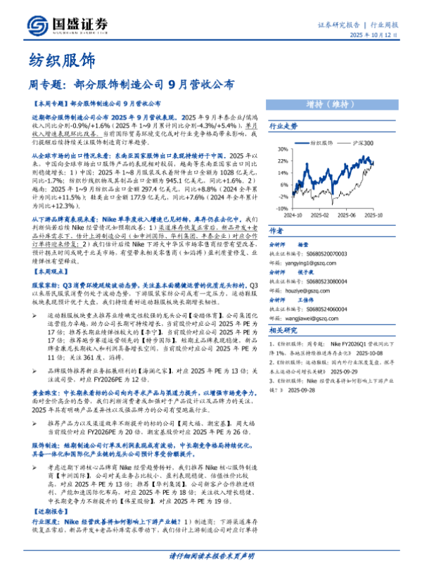 【国盛证券】【202510】纺织服饰周专题:部分服饰制造公司9月营收公布-17页