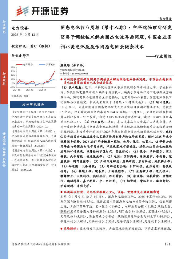 【开源证券】【202510】电力设备行业固态电池行业周报(第十八期):中科院物理所研发阴离子调控技术解决固态电池界面问题,中国企业亮相北美电池展展示固态电池全链条技术-11页