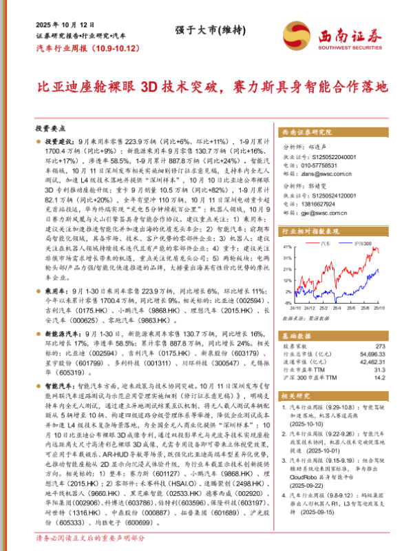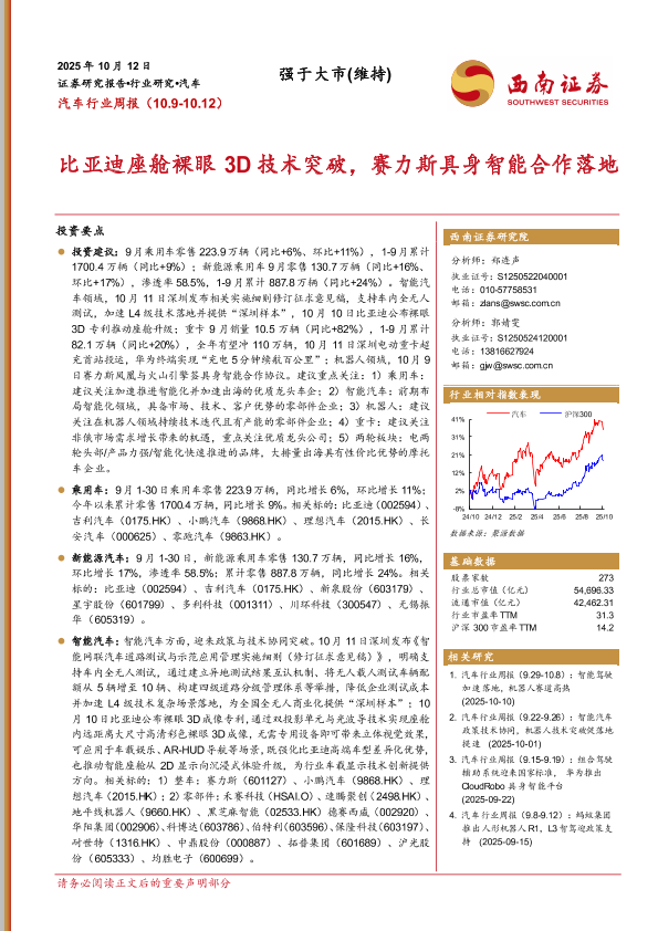 【西南证券】【202510】比亚迪座舱裸眼3D技术突破,赛力斯具身智能合作落地-21页