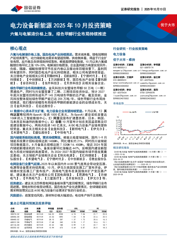 【国信证券】【202510】电力设备新能源2025年10月投资策略:六氟与电解液价格上涨,绿色甲醇行业布局持续推进-25页