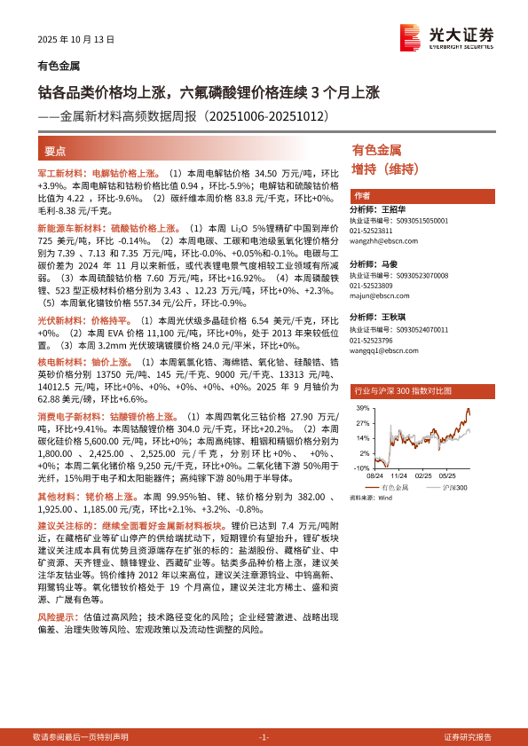 【光大证券】【202510】钴各品类价格均上涨,六氟磷酸锂价格连续3个月上涨——金属新材料高频数据周报(20251006-20251012)-24页