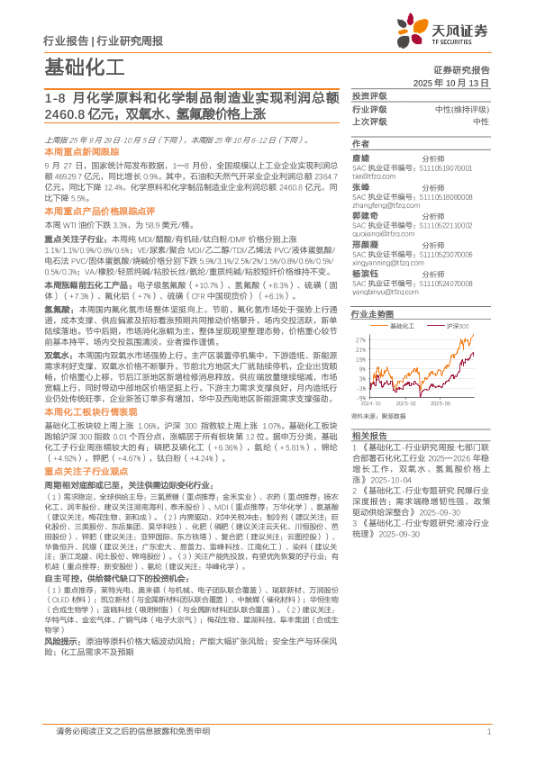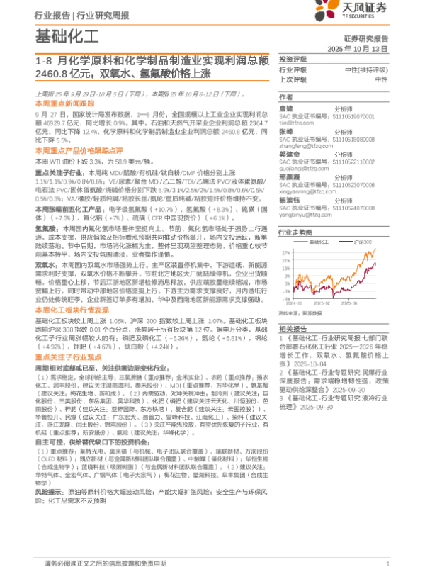【天风证券】【202510】基础化工行业研究周报:1-8月化学原料和化学制品制造业实现利润总额2460.8亿元,双氧水、氢氟酸价格上涨-21页