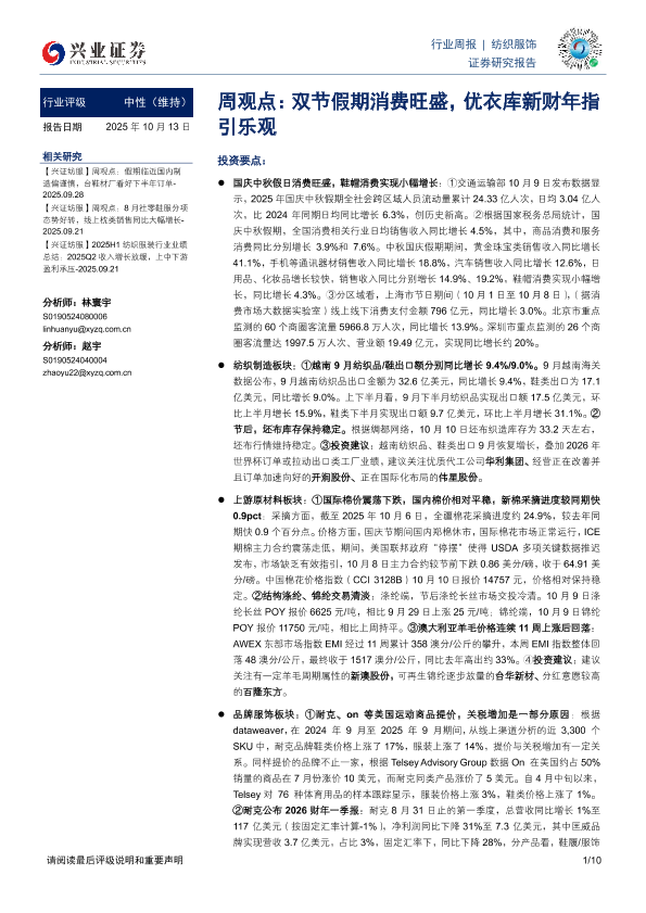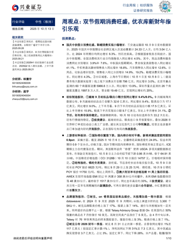 【兴业证券】【202510】纺织服饰行业周报:双节假期消费旺盛,优衣库新财年指引乐观-10页