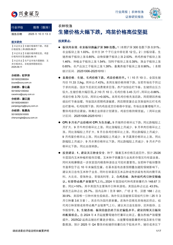 【兴业证券】【202510】农林牧渔行业周报:生猪价格大幅下跌,鸡苗价格高位坚挺-17页