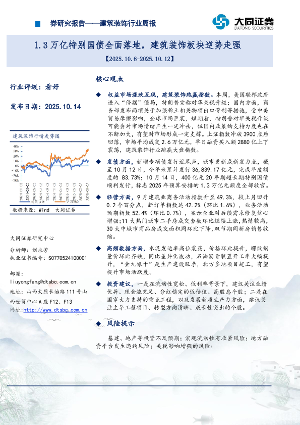 【大同证券】【202510】1.3万亿特别国债全面落地,建筑装饰板块逆势走强-15页