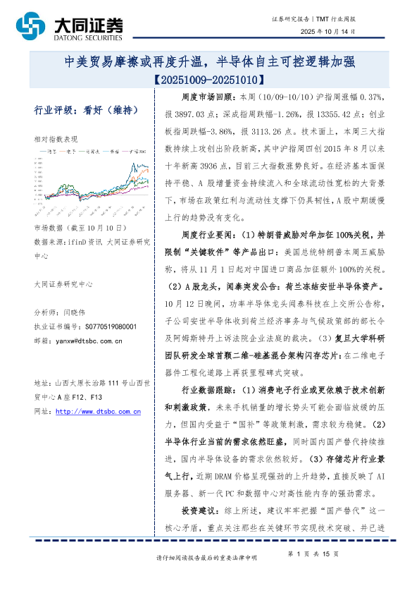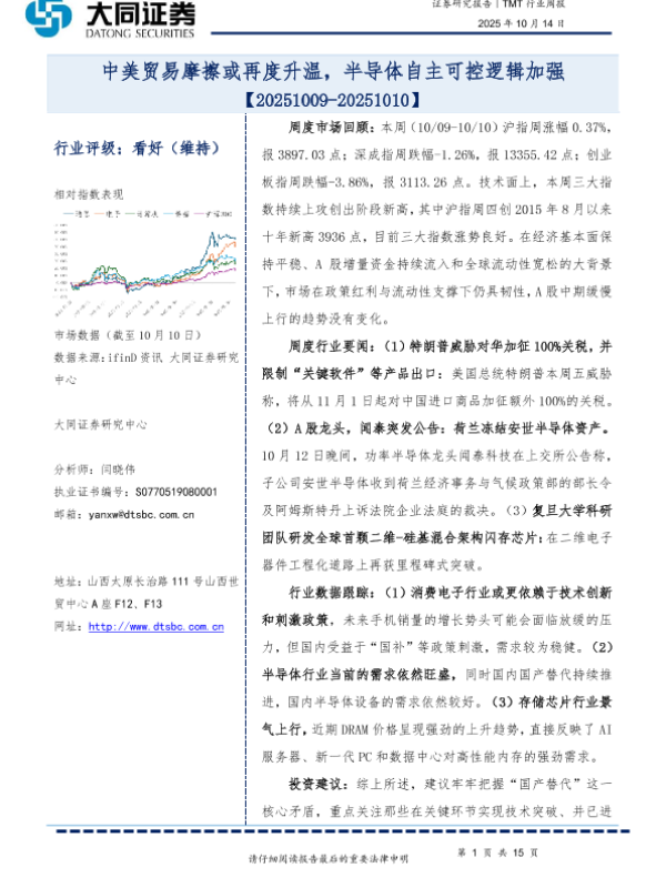 【大同证券研究中心】【202510】TMT行业周报:中美贸易摩擦或再度升温,半导体自主可控逻辑加强-15页