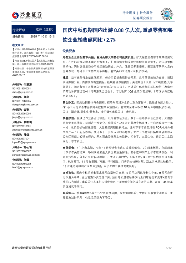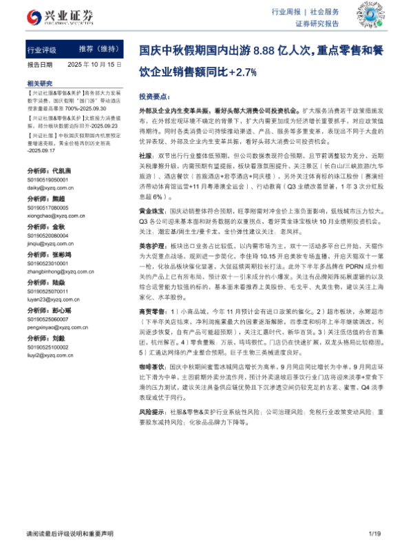 【兴业证券】【202510】社会服务行业周报:国庆中秋假期国内出游8.88亿人次,重点零售和餐饮企业销售额同比+2.7%-19页