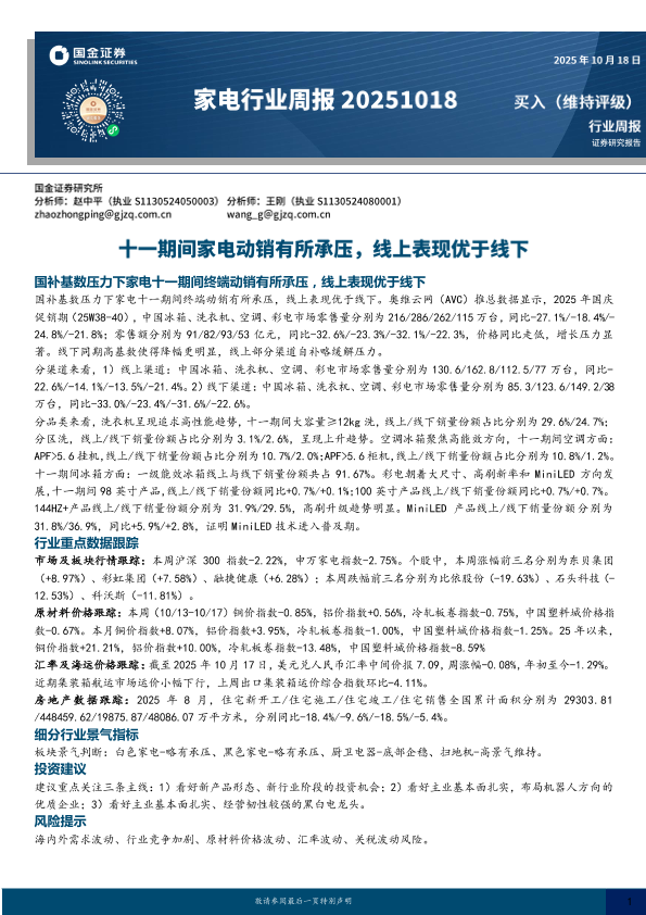 【国金证券】【202510】20251018-国金证券-家电行业周报:十一期间家电动销有所承压,线上表现优于线下-12页
