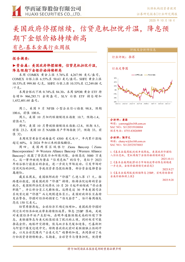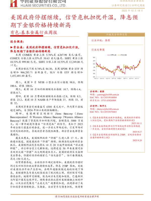 【华西证券】【202510】美国政府停摆继续,信贷危机担忧升温,降息预期下金银价格持续新高-23页