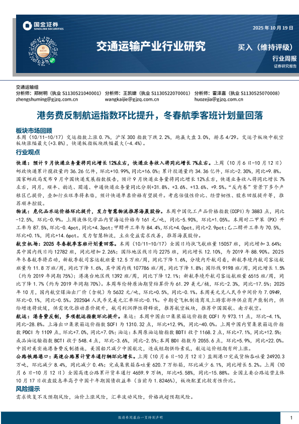 【国金证券】【202510】交通运输产业行业研究:港务费反制航运指数环比提升,冬春航季客班计划量回落-17页
