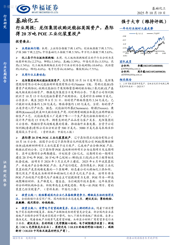 【华福证券】【202510】基础化工行业周报:龙佰集团收购泛能拓英国资产,鼎际得20万吨POE工业化装置投产-22页
