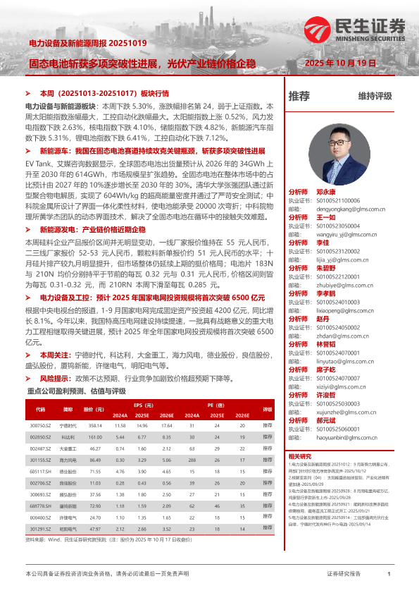 【民生证券】【202510】固态电池斩获多项突破性进展,光伏产业链价格企稳-20页