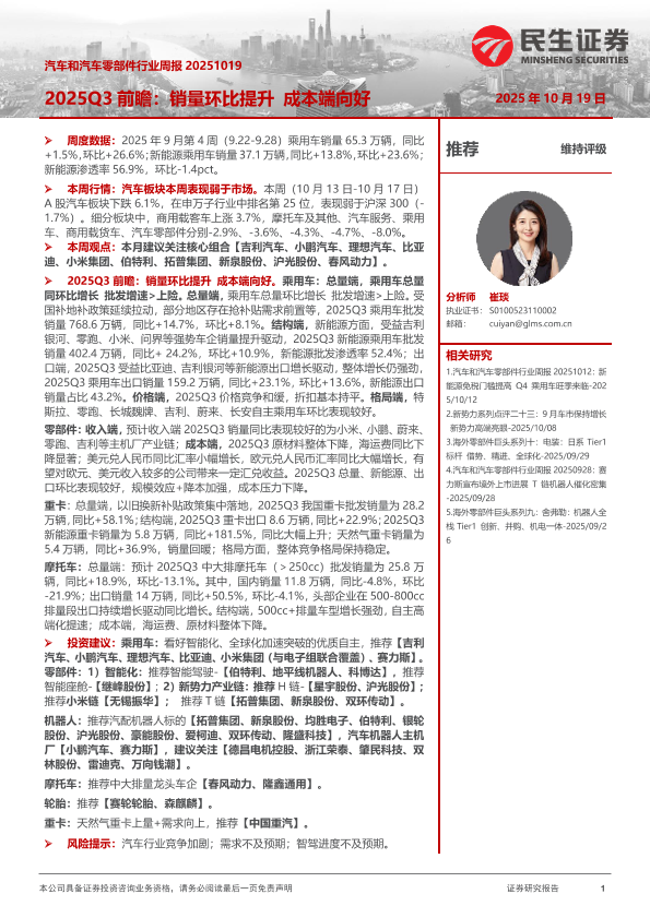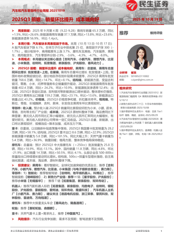 【民生证券】【202510】汽车和汽车零部件行业周报:2025Q3前瞻:销量环比提升 成本端向好-41页
