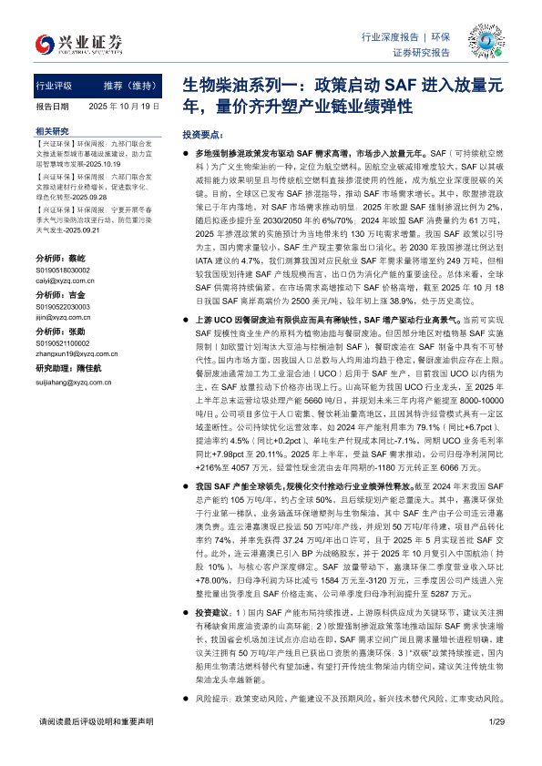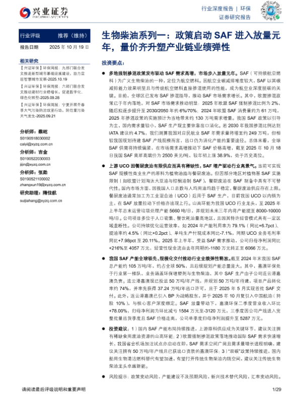 【兴业证券】【202510】生物柴油系列一:政策启动 SAF进入放量元年,量价齐升塑产业链业绩弹性-29页