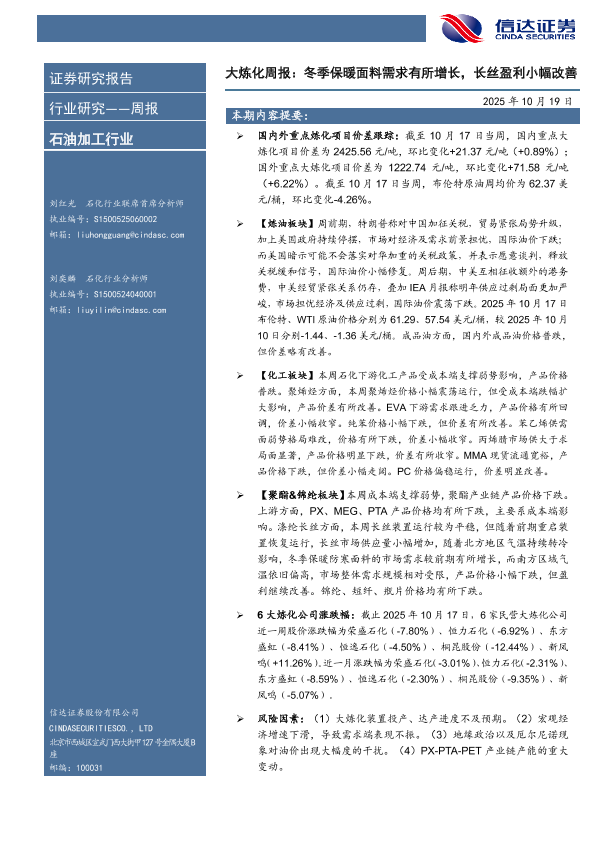 【信达证券】【202510】大炼化周报:冬季保暖面料需求有所增长,长丝盈利小幅改善-25页