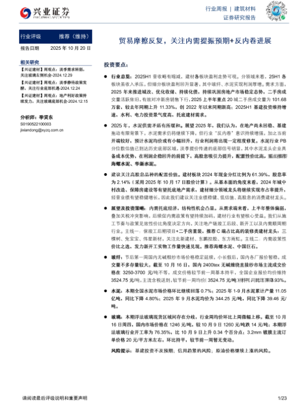 【兴业证券】【202510】20251020-兴业证券-建筑材料行业周报:贸易摩擦反复,关注内需提振预期+反内卷进展.pdf-23页
