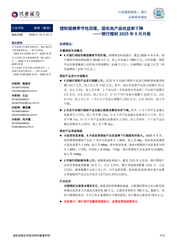 【兴业证券】【202510】银行理财2025年9月月报:理财规模季节性回落,固收类产品收益率下降-13页
