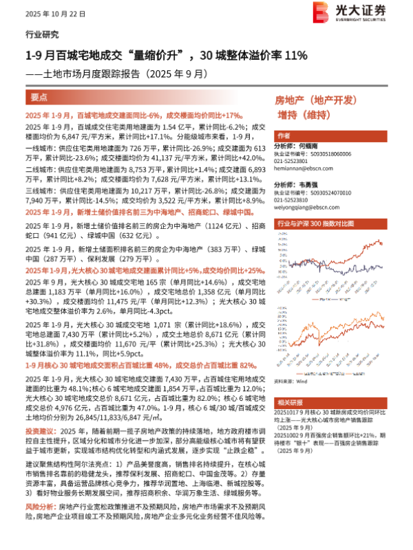 【光大证券】【202510】1-9月百城宅地成交“量缩价升”,30城整体溢价率 11%——土地市场月度跟踪报告(2025年 9月)-16页