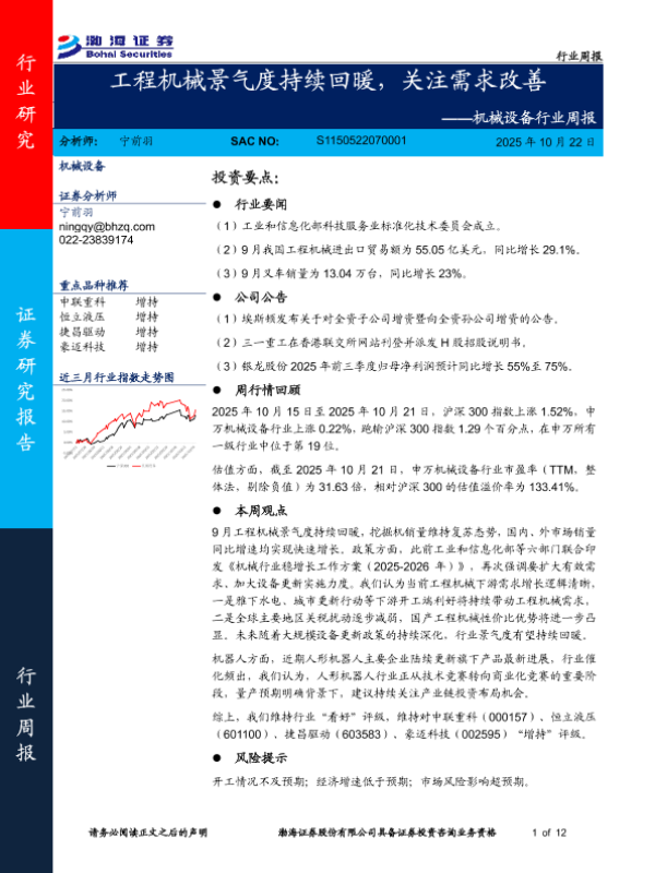 【渤海证券】【202510】工程机械景气度持续回暖,关注需求改善——机械设备行业周报-12页