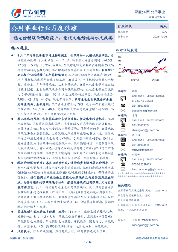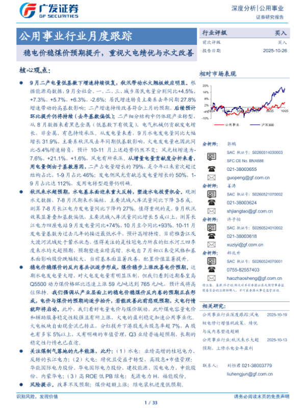 【广发证券】【202510】公用事业行业月度跟踪:稳电价稳煤价预期提升,重视火电绩优与水文改善-33页