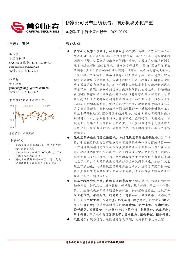 【首创证券】【20230205】国防军工行业简评报告:多家公司发布业绩预告,细分板块分化严重-23页