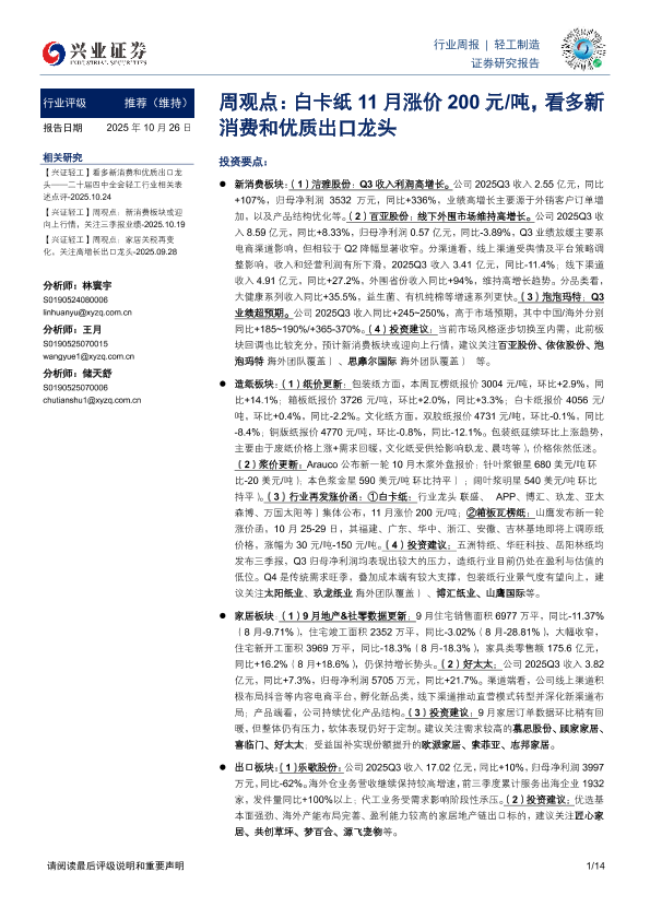 【兴业证券】【202510】白卡纸11月涨价200元 吨,看多新消费和优质出口龙头-14页