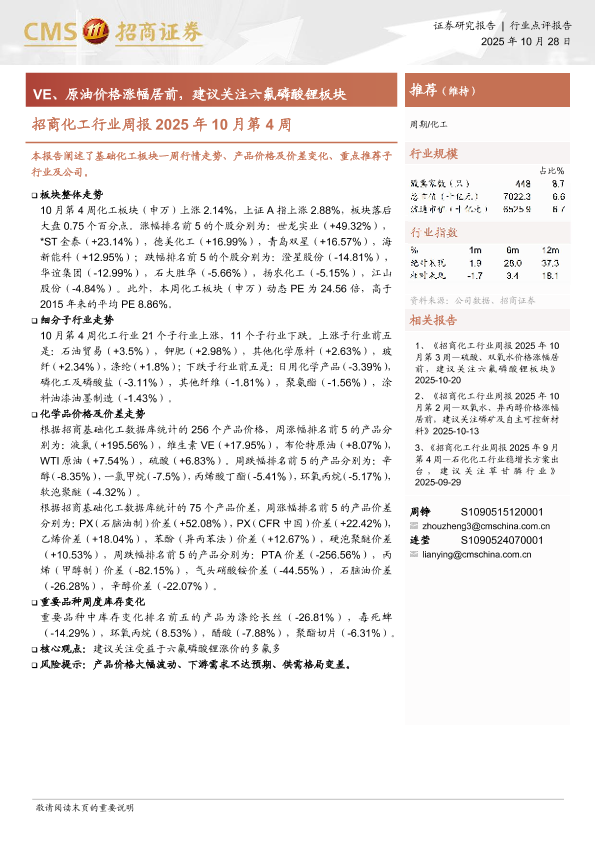 【海通证券】【202510】招商证券-化工行业周报2025年10月第4周:VE、原油价格涨幅居前,建议关注六氟磷酸锂板块-16页
