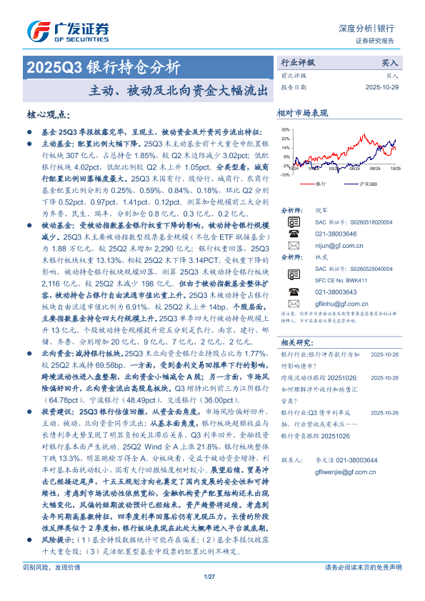 【广发证券】【202510】2025Q3银行持仓分析:主动、被动及北向资金大幅流出-27页