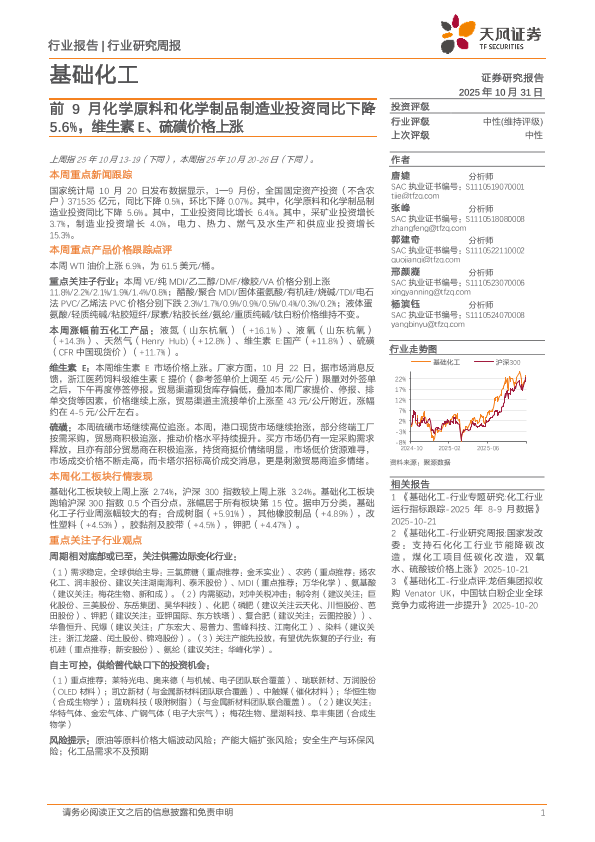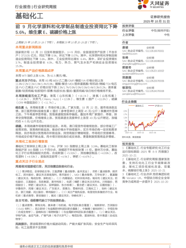 【天风证券】【202510】基础化工行业研究周报:前9月化学原料和化学制品制造业投资同比下降5.6%,维生素E、硫磺价格上涨-21页