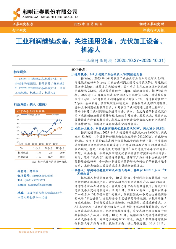 【湘财证券】【202510】工业利润继续改善,关注通用设备、光伏加工设备、机器人-16页