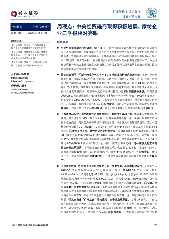 【兴业证券】【202511】纺织服饰行业周观点:中美经贸磋商取得积极进展,家纺企业三季报相对亮眼-10页