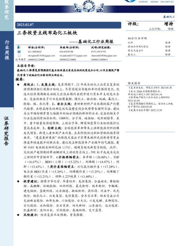 【国泰君安证券】【20230207】基础化工行业周报:三条投资主线布局化工板块-22页