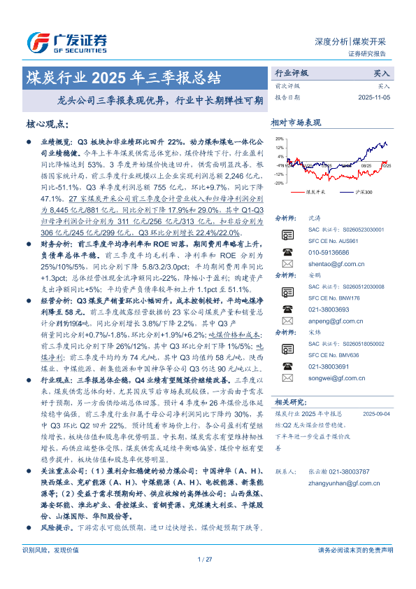 【广发证券】【202511】煤炭行业 2025年三季报总结 龙头公司三季报表现优异,行业中长期弹性可期-27页