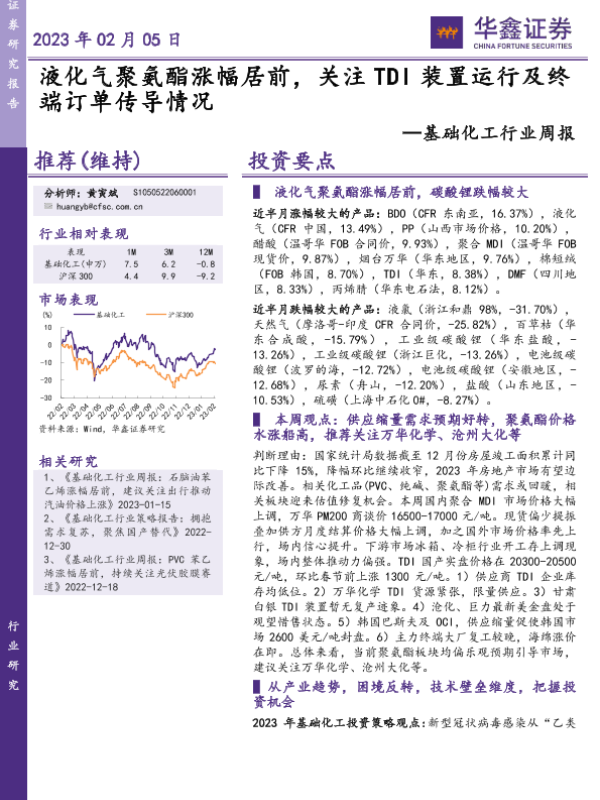 【华鑫证券】【20230205】基础化工行业周报:液化气聚氨酯涨幅居前,关注TDI装置运行及终端订单传导情况-38页