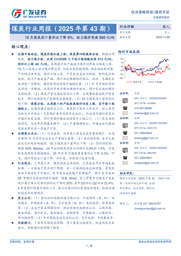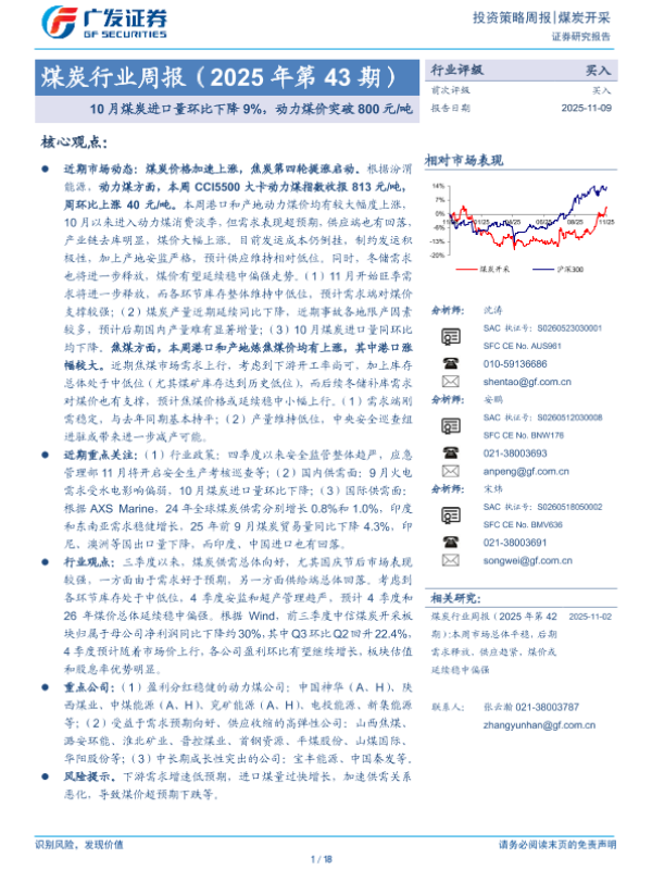 【广发证券】【202511】煤炭行业周报(2025年第43期):10月煤炭进口量环比下降9%,动力煤价突破800元 吨-18页
