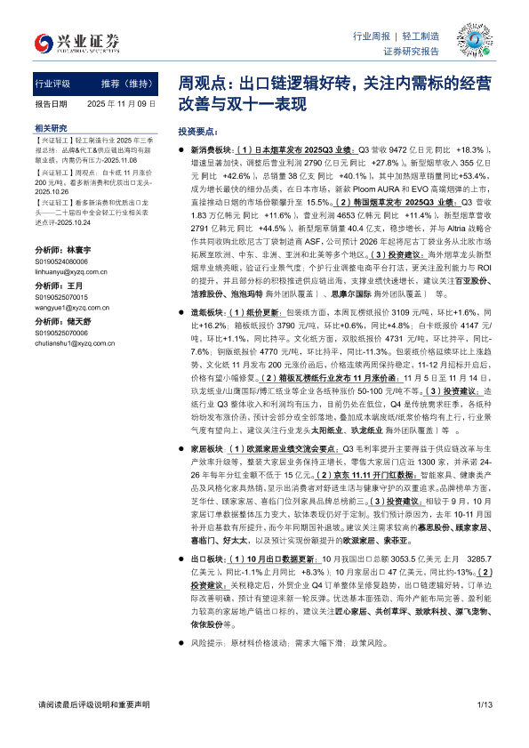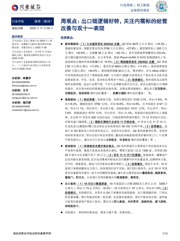 【兴业证券】【202511】轻工制造周观点:出口链逻辑好转,关注内需标的经营改善与双十一表现-13页