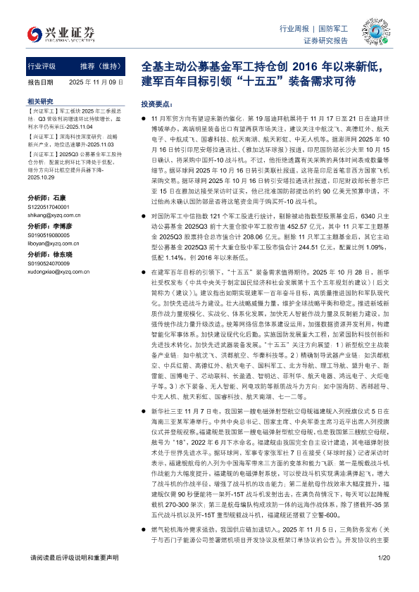 【兴业证券】【202511】国防军工行业周报:全基主动公募基金军工持仓创2016年以来新低,建军百年目标引领“十五五”装备需求可待-20页