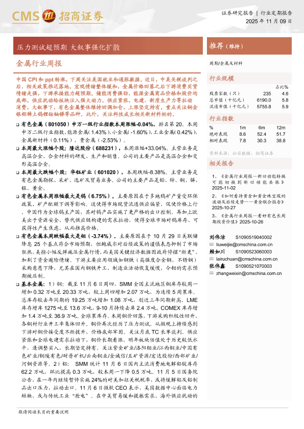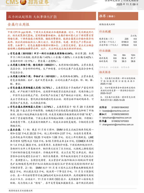 宏观经济 大宗商品 有色金属 行业周报 投资策略
