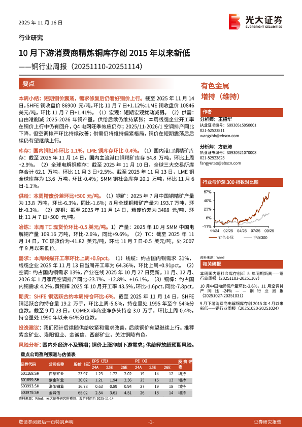 【光大证券】【202511】10月下游消费商精炼铜库存创2015年以来新低——铜行业周报(20251110-20251114)-18页