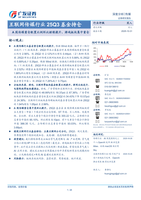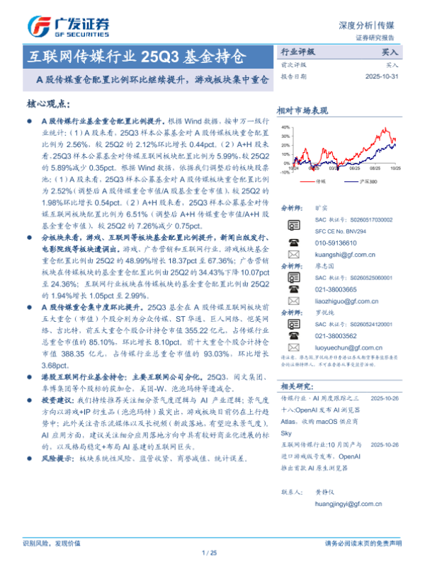 【广发证券】【202510】互[Table_联]网传媒行业 25Q3基金持仓:A股传媒重仓配置比例环比继续提升,游戏板块集中重仓-25页