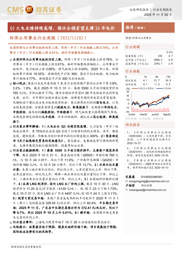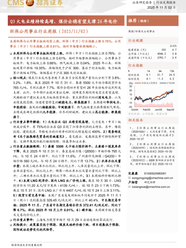 环保 火电业绩 煤价企稳 碳市场 公用事业