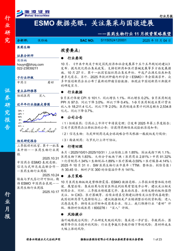【渤海证券】【202511】ESMO数据亮眼,关注集采与国谈进展——医药生物行业 11月投资策略展望-23页