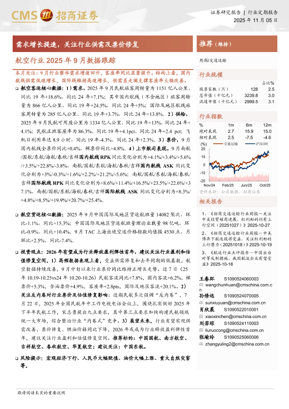 【海通证券】【202511】航空行业2025年9月数据跟踪:需求增长提速,关注行业供需及票价修复-13页