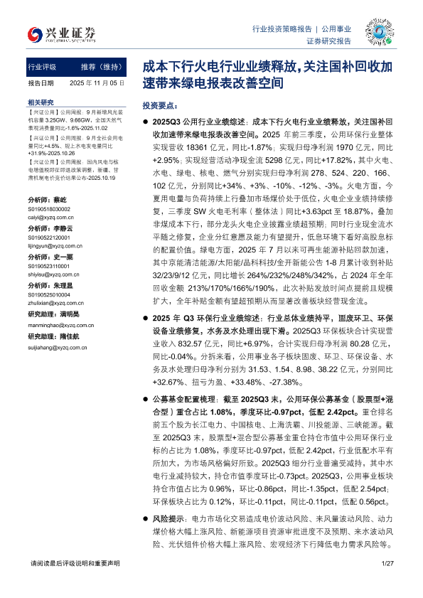 【兴业证券】【202511】公用事业:成本下行火电行业业绩释放,关注国补回收加速带来绿电报表改善空间-27页