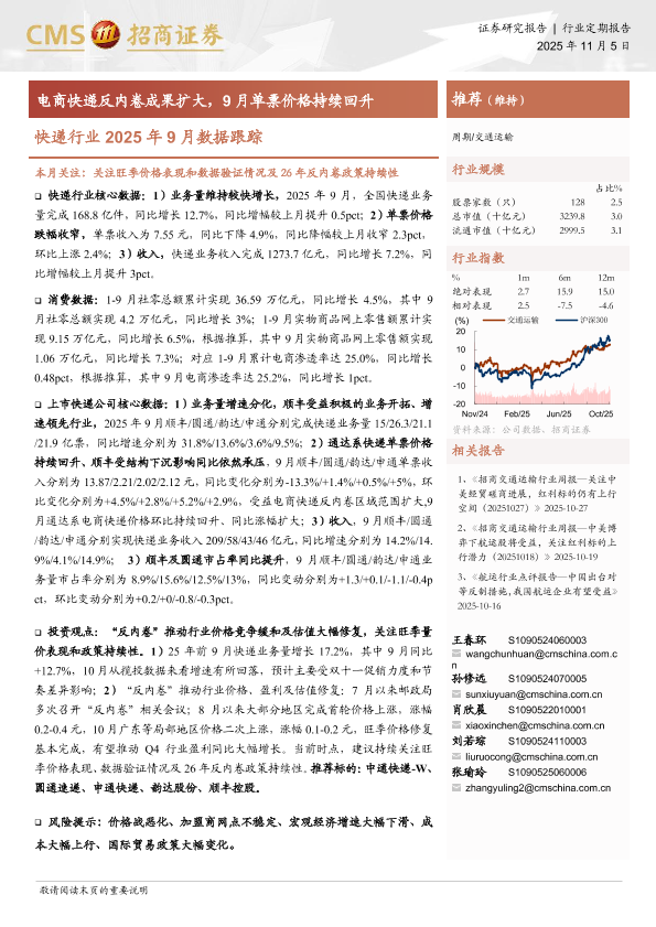 【海通证券】【202511】快递行业2025年9月数据跟踪:电商快递反内卷成果扩大,9月单票价格持续回升-14页