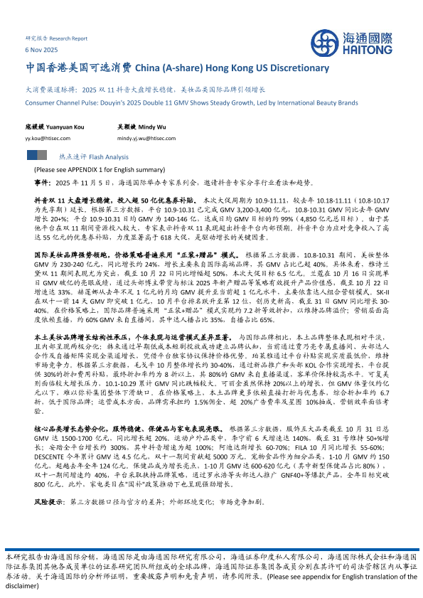 【海通国际】【202511】大消费渠道脉搏:2025双11抖音大盘增长稳健,美妆品类国际品牌引领增长-10页