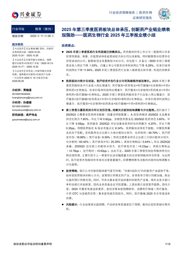 【兴业证券】【202511】医药生物行业2025年三季报业绩小结:2025年第三季度医药板块总体承压,创新药产业链业绩表现强劲-18页