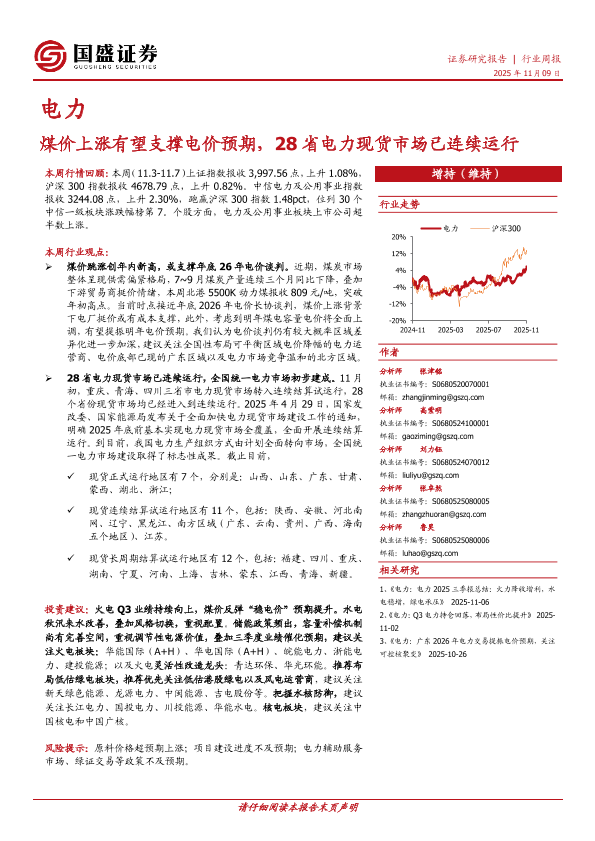 【国盛证券】【202511】20251109-国盛证券-电力行业周报:煤价上涨有望支撑电价预期,28省电力现货市场已连续运行-13页