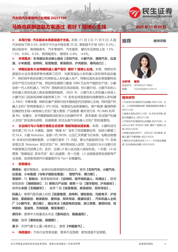 【民生证券】【202511】汽车和汽车零部件行业周报:马斯克薪酬激励方案通过 看好T链核心主线-26页