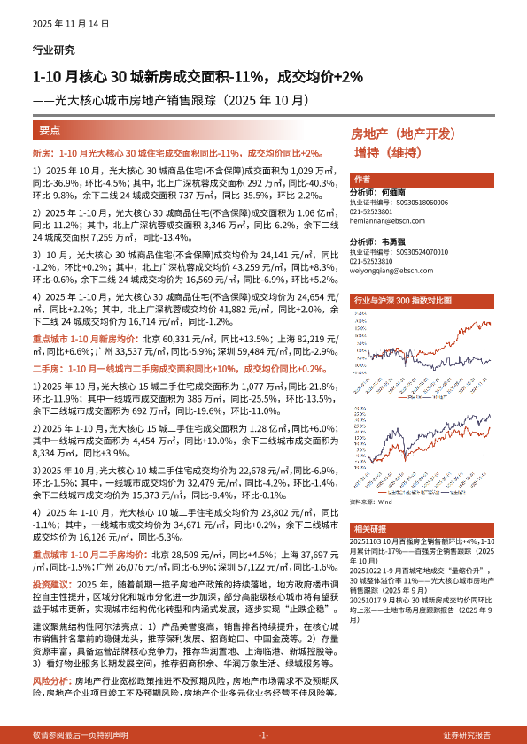 【光大证券】【202511】2025年11月14日-光大核心城市房地产销售跟踪(2025年10月):1-10月核心30城新房成交面积-11%,成交均价+2%-12页